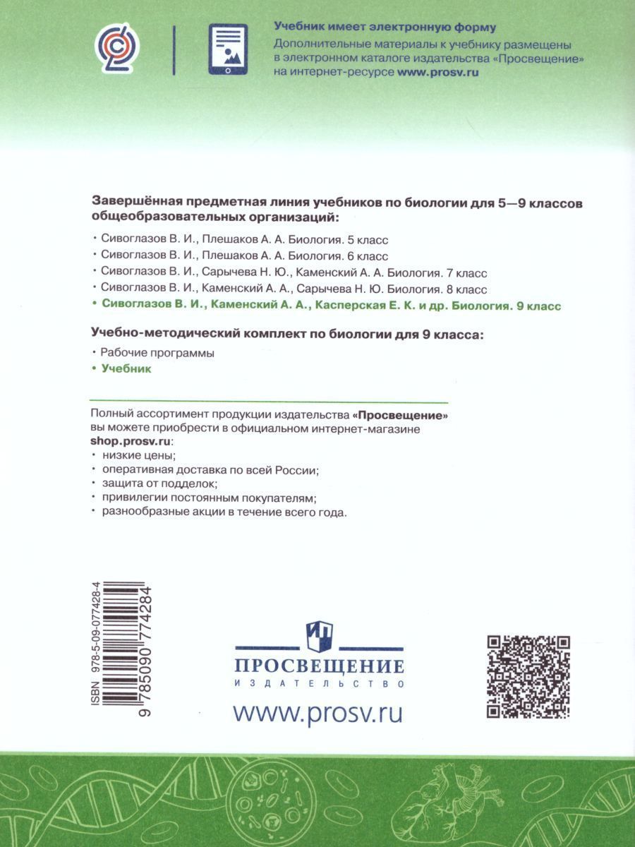 Учебник для 9 класса завершает новую линию УМК по биологии для 5-9 классов, созданную авторским коллективом под руководством Сивоглазова В.И. Он отвечает базисному учебному плану по биологии (в объеме по 2 ч/нед.) и авторской рабочей программе. В нем рассмотрены вопросы, посвященные изучению общебиологических закономерностей. Курс построен по принципу уровневой организации жизни. Сочетание традиционного подхода в последовательности изучения биологических курсов (растения, животные, человек) и концентрического принципа структурирования материала (с основами общей биологии в 9 кл.) позволило объединить лучший опыт отечественной школы. Учебник является надёжным инструментом, помогающим в достижении образовательных результатов по биологии и обеспечивает: • систематизацию полученных знаний о живой природе в 5—8 классах; • расширение познавательных интересов, интеллектуальных и творческих способностей учащихся; • формирование и развитие умений, связанных с выполнением лабораторных и практических работ; • воспитание ответственного и бережного отношения к окружающей природе, формирование экологического мышления; • развитие познавательной, практической и творческой деятельности учащихся. Реализация авторской концепции осуществлена в рамках единого подхода к содержанию, методике и принципам конструирования учебной книги по всей линии. Основной материал параграфов расширяет рубрика "Для любознательных", а методическая составляющая содержит систему заданий, которая позволяет отрабатывать широкий перечень умений и компетенций. Единая навигационная система учебников позволяет рационально и эффективно организовывать учебный процесс, в том числе с использованием разных технологий обучения.Характеристики