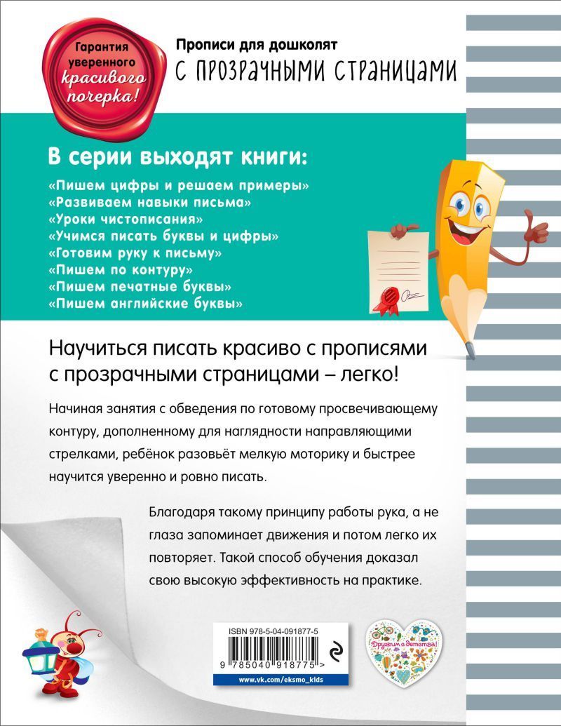 Удобные и необычные прописи с прозрачными страницами - это отличная возможность развить у ребёнка мелкую моторику и эффективно подготовить его к школе. Занимаясь по книге, ребёнок сможет укрепить мелкие мышцы кисти руки и научиться красиво писать. НачинаяХарактеристики