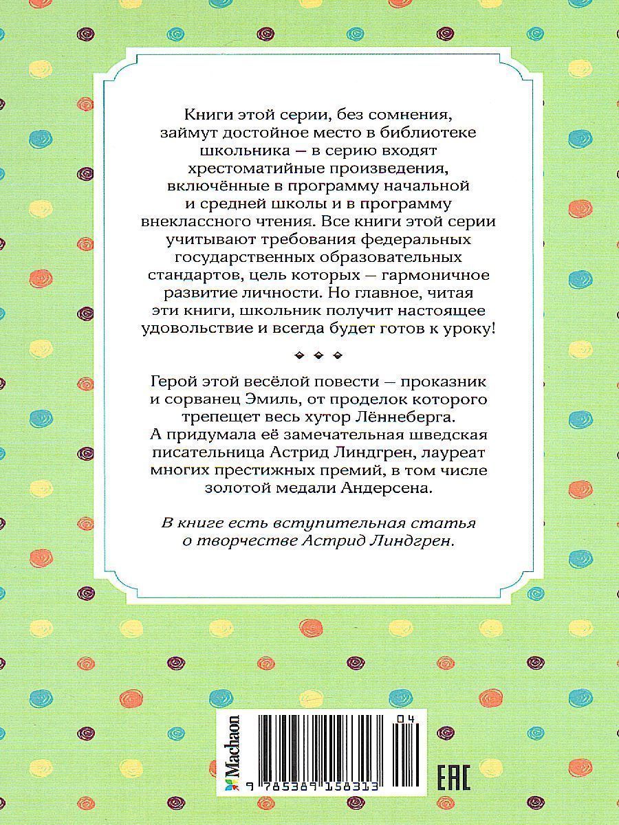 Герой этой весёлой повести – проказник и сорванец Эмиль, от его проделок трепещет весь хутор Лённеберга. А придумала её замечательная шведская писательница Астрид Линдгрен, лауреат многих престижных премий, в том числе золотой медали Андерсена.Характеристики