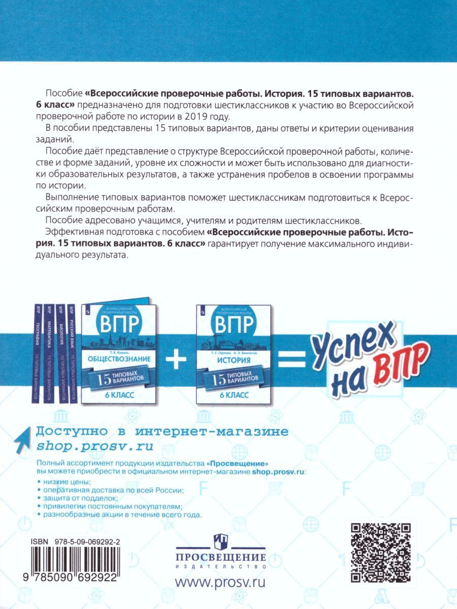 Пособие создано для подготовки шестиклассников к участию в Всероссийской проверочной работе по истории. В пособии представлены 15 типовых вариантов, составленных в соответствии с демоверсией 2019 года, даны ответы и критерии оценивания заданий предложенных вариантов ВПР. Выполнение типовых вариантов поможет шестиклассникам подготовиться к Всероссийским проверочным работам. Пособие дополнительно знакомит учащихся с процедурой проведения ВПР и содержит методические рекомендации по выполнению предлагаемых заданий. Учителя могут использовать пособие для диагностики и устранения пробелов в освоении программы по данному предмету на уроках, во внеурочной деятельности. Пособие адресовано учащимся, учителям, методистам, репетиторам и родителям шестиклассников.Характеристики