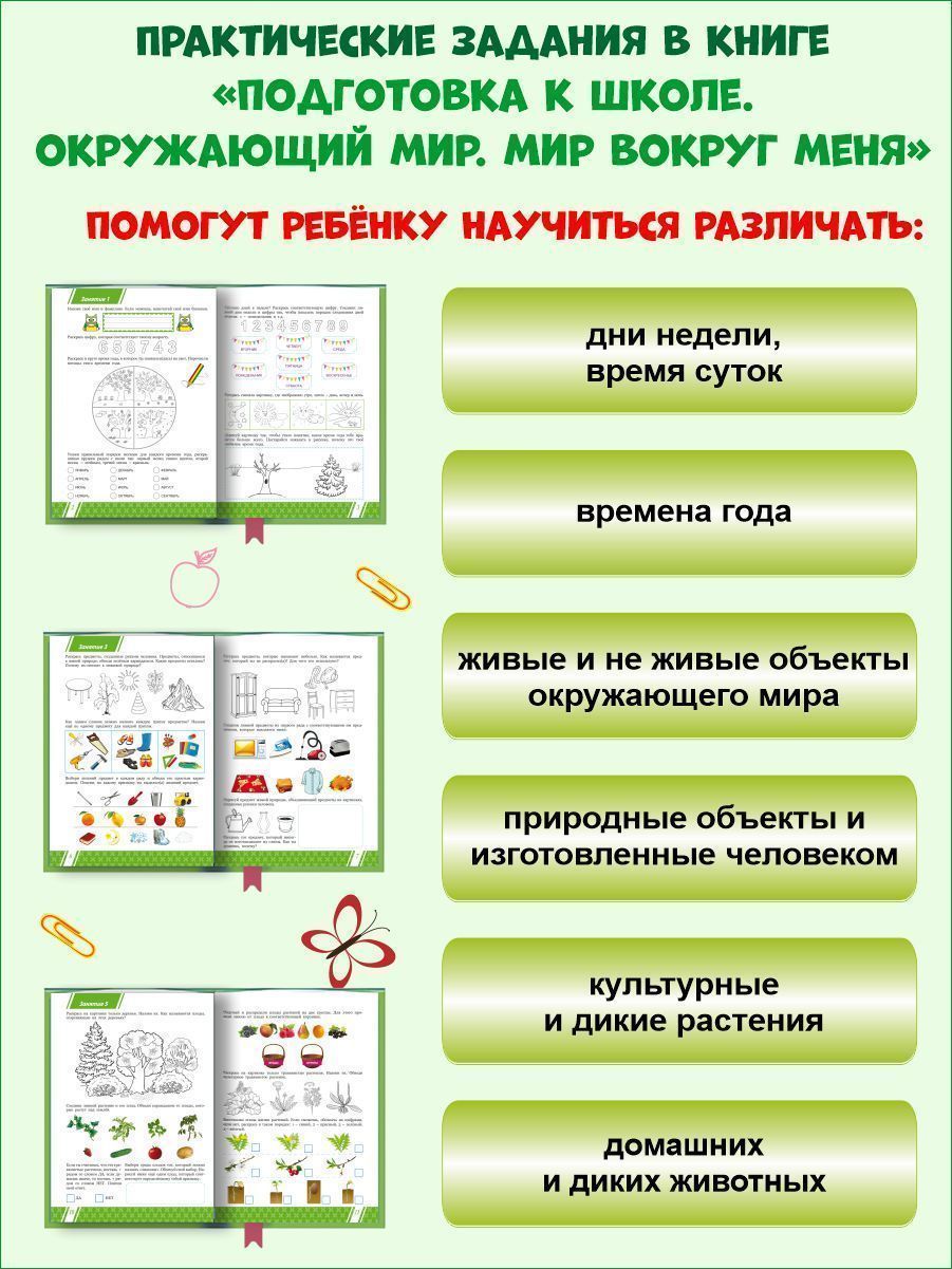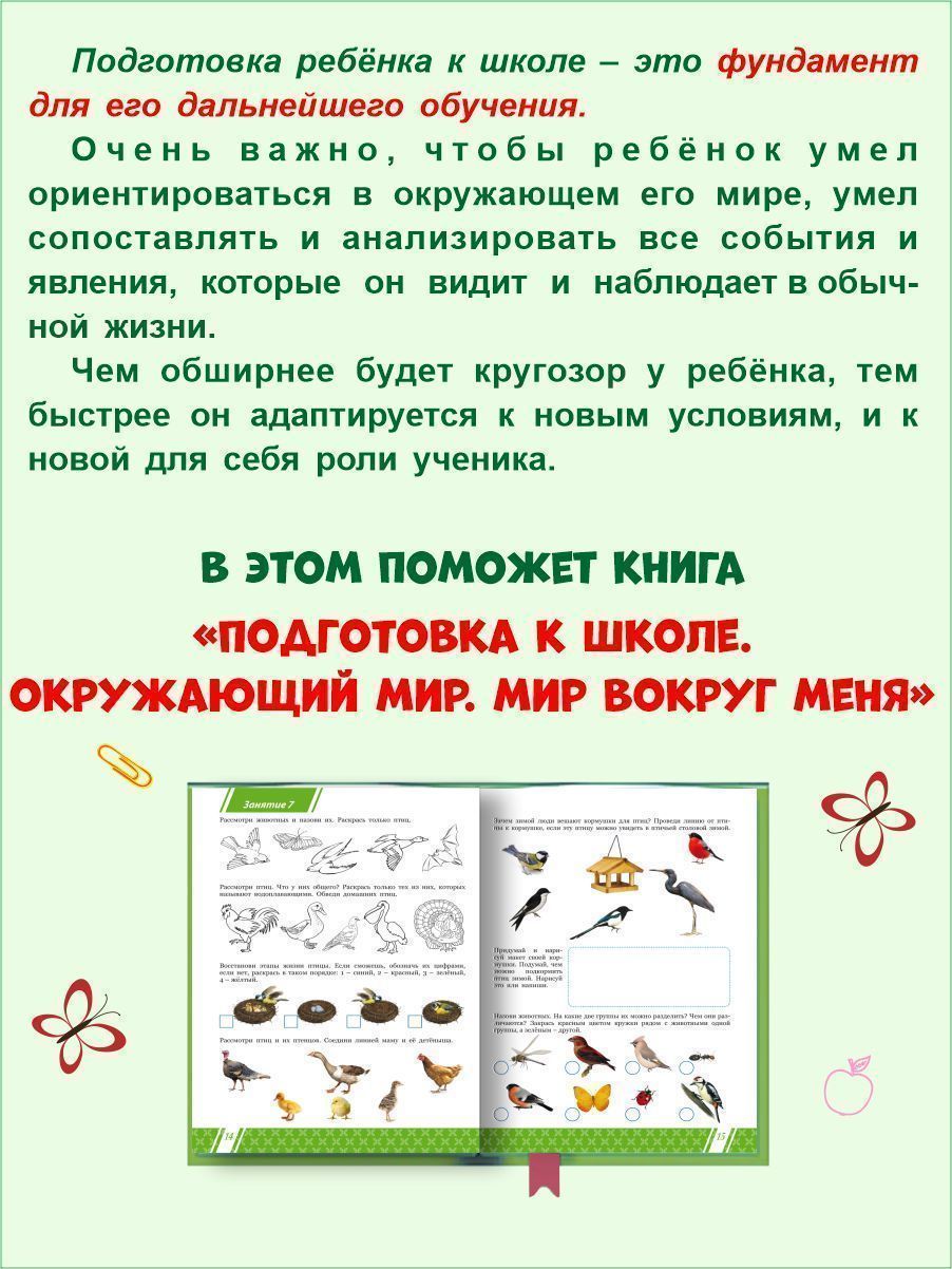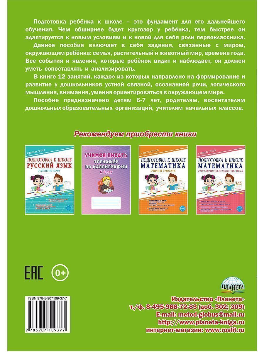 Подготовка ребёнка к школе – это фундамент для его дальнейшего обучения. Чем обширнее будет кругозор у ребёнка, тем быстрее он адаптируется к новым условиям и к новой для себя роли первоклассника. Данное пособие включает в себя задания, связанные с миром, окружающим ребёнка: семья, растительный и животный мир, времена года. Все события и явления, которые ребёнок видит и наблюдает, он должен уметь сопоставлять и анализировать. В книге 12 занятий, каждое из которых направлено на формирование и развитие у дошкольников устной связной, осознанной речи, логического мышления, внимания, умения ориентироваться в окружающем мире. Пособие предназначено детям 6-7 лет, родителям, воспитателям дошкольных образовательных организаций, учителям начальных классов.Характеристики