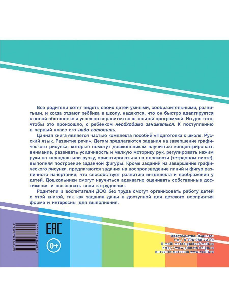 Все родители хотят видеть своих детей умными, сообразительными, развитыми, и когда отдают ребёнка в школу, надеются, что он быстро адаптируется к новой обстановке и успешно справится со школьной программой. Но для того, чтобы это произошло, с ребёнком необходимо заниматься. К поступлению в первый класс его надо готовить. Данная книга является частью комплекта пособий «Подготовка к школе. Русский язык. Развитие речи». Детям предлагаются задания на завершение графического рисунка, которые помогут дошкольникам научиться концентрировать внимание, развивать усидчивость и мелкую моторику рук, регулировать нажим руки на карандаш или ручку, ориентироваться на плоскости (тетрадном листе), выполняя построение заданной фигуры. Кроме заданий на завершение графического рисунка, предлагаются задания на воспроизведение линий и фигур различного начертания, что способствует развитию интеллекта и воображения у детей. Дошкольники смогут научиться адекватно оценивать собственные достижения и осознавать свои затруднения. РодителиХарактеристики