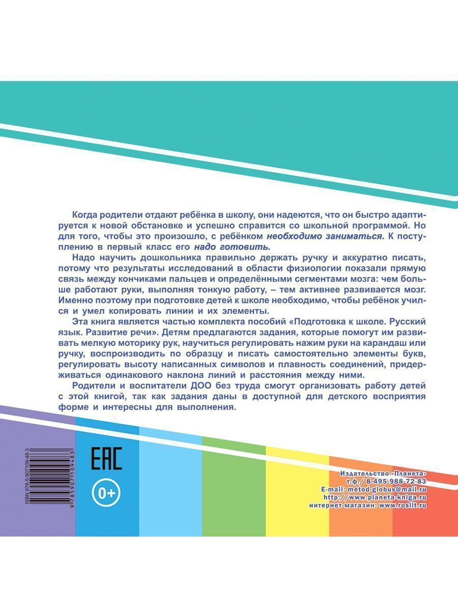 Когда родители отдают ребёнка в школу, они надеются, что он быстро адаптируется к новой обстановке и успешно справится со школьной программой. Но для того, чтобы это произошло, с ребёнком необходимо заниматься. К поступлению в первый класс его надо готовить. Надо научить дошкольника правильно держать ручку и аккуратно писать, потому что результаты исследований в области физиологии показали прямую связь между кончиками пальцев и определёнными сегментами мозга: чем больше работают руки, выполняя тонкую работу, – тем активнее развивается мозг. Именно поэтому при подготовке детей к школе необходимо, чтобы ребёнок учился и умел копировать линии и их элементы. Эта книга является частью комплекта пособий «Подготовка к школе. Русский язык. Развитие речи». Детям предлагаются задания, которые помогут им развивать мелкую моторику рук, научиться регулировать нажим руки на карандаш или ручку, воспроизводить по образцу и писать самостоятельно элементы букв, регулировать высоту написанных символов и плавность соединений, прХарактеристики