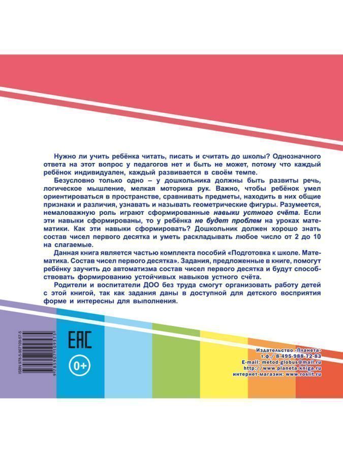 Нужно ли учить ребёнка читать, писать и считать до школы? Однозначного ответа на этот вопрос у педагогов нет и быть не может, потому что каждый ребёнок индивидуален, каждый развивается в своём темпе. Безусловно только одно – у дошкольника должны быть развиты речь, логическое мышление, мелкая моторика рук. Важно, чтобы ребёнок умел ориентироваться в пространстве, сравнивать предметы, находить в них общие признаки и различия, узнавать и называть геометрические фигуры. Разумеется, немаловажную роль играют сформированные навыки устного счёта. Если эти навыки сформированы, то у ребёнка не будет проблем на уроках математики. Как эти навыки сформировать? Дошкольник должен хорошо знать состав чисел первого десятка и уметь раскладывать любое число от 2 до 10 на слагаемые. Данная книга является частью комплекта пособий «Подготовка к школе. Математика. Состав чисел первого десятка». Задания, предложенные в книге, помогут ребёнку заучить до автоматизма состав чисел первого десятка и будут способствовать формированию устоХарактеристики