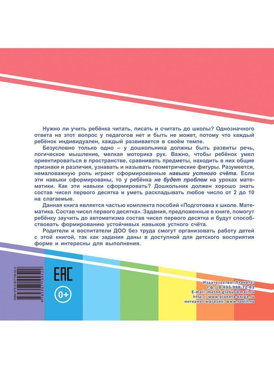 Нужно ли учить ребёнка читать, писать и считать до школы? Однозначного ответа на этот вопрос у педагогов нет и быть не может, потому что каждый ребёнок индивидуален, каждый развивается в своём темпе. Безусловно только одно – у дошкольника должны быть развиты речь, логическое мышление, мелкая моторика рук. Важно, чтобы ребёнок умел ориентироваться в пространстве, сравнивать предметы, находить в них общие признаки и различия, узнавать и называть геометрические фигуры. Разумеется, немаловажную роль играют сформированные навыки устного счёта. Если эти навыки сформированы, то у ребёнка не будет проблем на уроках математики. Как эти навыки сформировать? Дошкольник должен хорошо знать состав чисел первого десятка и уметь раскладывать любое число от 2 до 10 на слагаемые. Данная книга является частью комплекта пособий «Подготовка к школе. Математика. Состав чисел первого десятка». Задания, предложенные в книге, помогут ребёнку заучить до автоматизма состав чисел первого десятка и будут способствовать формированию устоХарактеристики