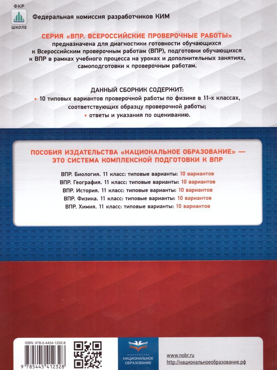 Серия "ВПР. Всероссийские проверочные работы" подготовлена разработчиками вариантов для проведения Всероссийских проверочных работ. В сборнике представлены: - 10 типовых вариантов проверочной работы по физике в 11-х классах, составленных в соответствии с образцом проверочной работы; - инструкция по выполнению работы; - ответы и критерии оценивания; - карта индивидуальных достижений, фиксирующая результаты выполнения всех вариантов проверочной работы. Выполнение типовых вариантов предоставляет обучающимся возможность самостоятельно подготовиться к Всероссийским проверочным работам и объективно оценить уровень своей подготовки. Учителя могут использовать издания серии для организации контроля результатов освоения школьниками образовательных программ среднего общего образования и интенсивной подготовки обучающихся к Всероссийским проверочным работам.Характеристики