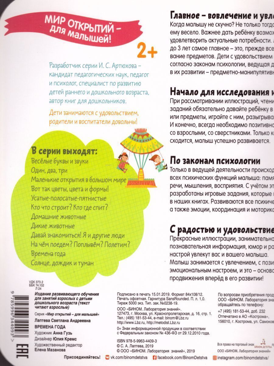 Не чтение, а игра! В руках малыша - яркая, познавательная, развивающая книжка. Читайте, рассматривайте рисунки. Обсуждайте их, выслушивайте всё, что скажет ребёнок. Называйте героев-помощников: попугая Поболтая, весёлого дятла-художника и других. Возьмите в руки похожие игрушки. Пусть малыш вместе с этими героями (или за них) отвечает на вопросы, дорисовывает, находит предметы, рассказывает. Угадывайте, составляйте предложения и короткие рассказы. Пусть это будет весело и доставит вам и малышу удовольствие! Главное - вовлечение и увлечение. Когда малышу не скучно? Не только тогда, когда ему весело. Важнее дать ребёнку возможность удовлетворить актуальные потребности. А для малыша до 3 лет самое главное - это, прежде всего, исследование предметов. Дети с удовольствием исследуют всё: согласно законам психологии, ведущая деятельность в их развитии - предметно-манипулятивная. Начало для исследования и игры. При рассматривании иллюстраций, чтении, выполнении заданий обязательно давайте ребёнку в руки игрушки или предметы, играйте с ним, разыгрывайте ситуации. И конечно, всегда необходимо позитивное общение: со взрослыми, со сверстниками. Только когда всё сходится, малыш успешно развивается. По законам психологии. Только в ведущей деятельности происходит развитие всех психических функций малыша: памяти, внимания, речи, мышления, восприятия. С учётом этого разработаны игровые задания, которые предлагаются в наших книгах. Развиваются все психические функции, а также эмоции, координация и моторика руки. С радостью и удовольствием! Прекрасные иллюстрации, занимательная познавательная информация, юмор и радостный настрой увлекут вас и вашего малыша. Малыш занимается с увлечением, с позитивным эмоциональным настроем, и это - основа для реального продвижения вперёд в его развитии!Характеристики