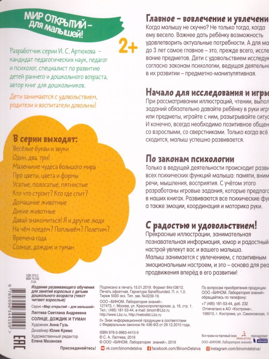 Не чтение, а игра! В руках малыша - яркая, познавательная, развивающая книжка. Читайте, рассматривайте рисунки. Обсуждайте их, выслушивайте всё, что скажет ребёнок. Называйте героев-помощников: попугая Поболтая, весёлого дятла-художника и других. Возьмите в руки похожие игрушки. Пусть малыш вместе с этими героями (или за них) отвечает на вопросы, дорисовывает, находит предметы, рассказывает. Угадывайте, составляйте предложения и короткие рассказы. Пусть это будет весело и доставит вам и малышу удовольствие! Главное - вовлечение и увлечение. Когда малышу не скучно? Не только тогда, когда ему весело. Важнее дать ребёнку возможность удовлетворить актуальные потребности. А для малыша до 3 лет самое главное - это, прежде всего, исследование предметов. Дети с удовольствием исследуют всё: согласно законам психологии, ведущая деятельность в их развитии - предметно-манипулятивная. Начало для исследования и игры. При рассматривании иллюстраций, чтении, выполнении заданий обязательно давайте ребёнку в руки игрушки или предметы, играйте с ним, разыгрывайте ситуации. И конечно, всегда необходимо позитивное общение: со взрослыми, со сверстниками. Только когда всё сходится, малыш успешно развивается. По законам психологии. Только в ведущей деятельности происходит развитие всех психических функций малыша: памяти, внимания, речи, мышления, восприятия. С учётом этого разработаны игровые задания, которые предлагаются в наших книгах. Развиваются все психические функции, а также эмоции, координация и моторика руки. С радостью и удовольствием! Прекрасные иллюстрации, занимательная познавательная информация, юмор и радостный настрой увлекут вас и вашего малыша. Малыш занимается с увлечением, с позитивным эмоциональным настроем, и это - основа для реального продвижения вперёд в его развитии!Характеристики
