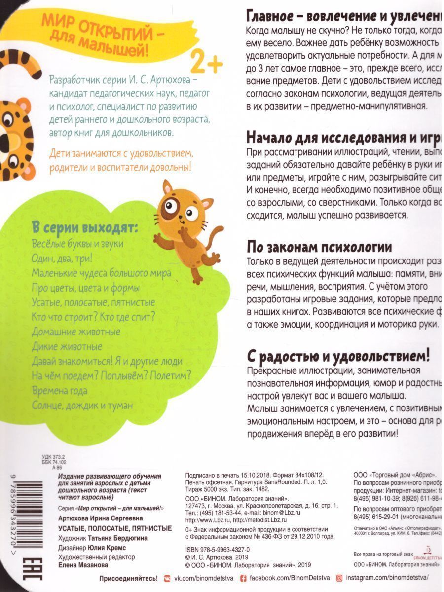 Разработчик серии И. С. Артюхова - кандидат педагогических наук, педагог и психолог, специалист по развитию детей раннего и дошкольного возраста, автор книг для дошкольников. Дети занимаются с удовольствием, родители и воспитатели довольны! Только в ведущей деятельности происходит развитие всех психических функций малыша: памяти, внимания, речи, мышления, восприятия. С учётом этого разработаны игровые задания, которые предлагаются в наших книгах. Развиваются все психические функции, а также эмоции, координация и моторика руки. Для дошкольного возраста.Характеристики