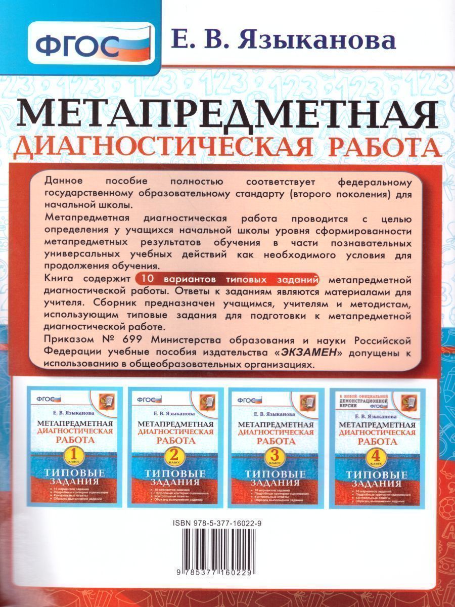 Данное пособие полностью соответствует федеральному государственному образовательному стандарту (второго поколения) для начальной школы. Метапредметная диагностическая работа проводится с целью определения у учащихся начальной школы уровня сформированности метапредметных результатов обучения в части познавательных универсальных учебных действий как необходимого условия для продолжения обучения. Книга содержит 10 вариантов типовых заданий метапредметной диагностической работы. Ответы к заданиям являются материалами для учителя. Сборник предназначен для учащихся, учителей и методистов, использующих типовые задания для подготовки к метапредметной диагностической работе.Характеристики