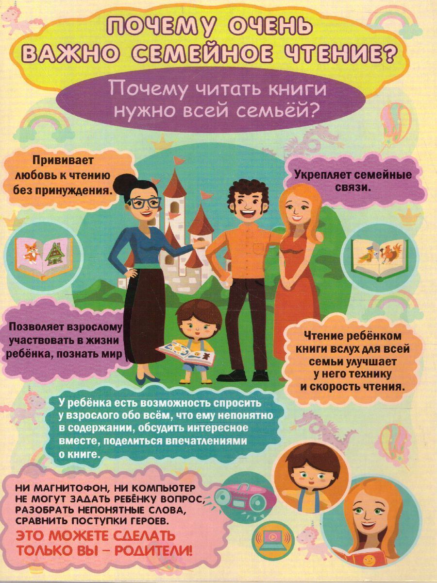 Взаимодействие с семьёй - актуальное направление ФГОС ДО. Данная ширма предназначена для информационного просвещения родителей. Ширма на 6 красочных страницах раскрывает понятие "семейное чтение", отвечает на вопросы: 1. Семейное чтение? Зачем? 2. С чего начинать семейное чтение? 3. Когда и какие лучше читать сказки? Ширмы с информацией предназначены для родителей и педагогов.Характеристики