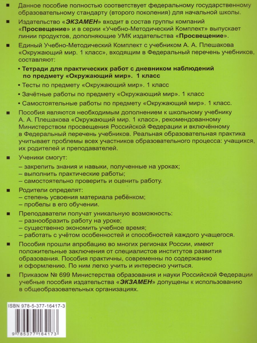 Данное пособие полностью соответствует федеральному государственному образовательному стандарту (второго поколения) для начальной школы. Через разноплановый материал, проблемные вопросы и задания автор помогает ребёнку восполнить пробелы в теоретических основах, выполнить практические работы и закрепить полученные на уроках знания. Пособие предназначено для работы в школе и дома, для фронтальной или самостоятельной работы.Характеристики