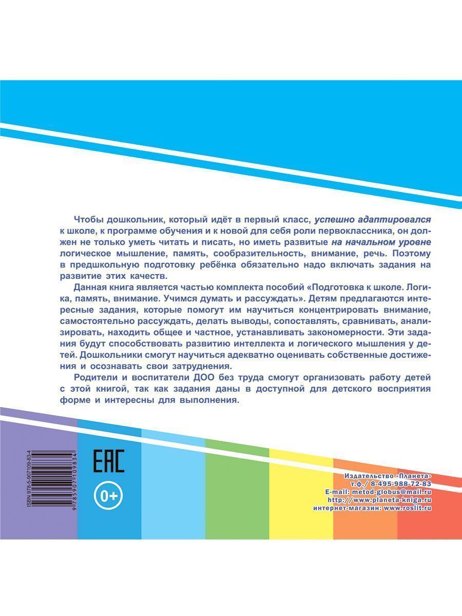 Чтобы дошкольник, который идёт в первый класс, успешно адаптировался к школе, к программе обучения и к новой для себя роли первоклассника, он должен не только уметь читать и писать, но иметь развитые на начальном уровне логическое мышление, память, сообразительность, внимание, речь. Поэтому в предшкольную подготовку ребёнка обязательно надо включать задания на развитие этих качеств. Данная книга является частью комплекта пособий «Подготовка к школе. Логика, память, внимание. Учимся думать и рассуждать». Детям предлагаются интересные задания, которые помогут им научиться концентрировать внимание, самостоятельно рассуждать, делать выводы, сопоставлять, сравнивать, анализировать, находить общее и частное, устанавливать закономерности. Эти задания будут способствовать развитию интеллекта и логического мышления у детей. Дошкольники смогут научиться адекватно оценивать собственные достижения и осознавать свои затруднения. Родители и воспитатели ДОО без труда смогут организовать работу детей с этой книгой, так как зХарактеристики