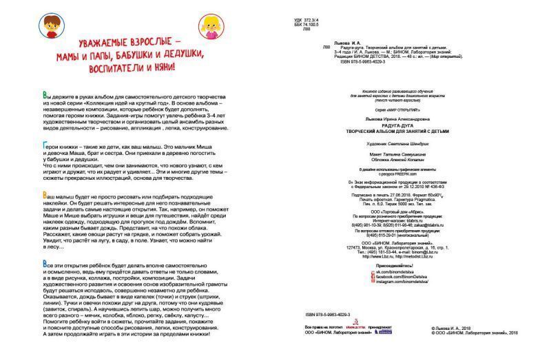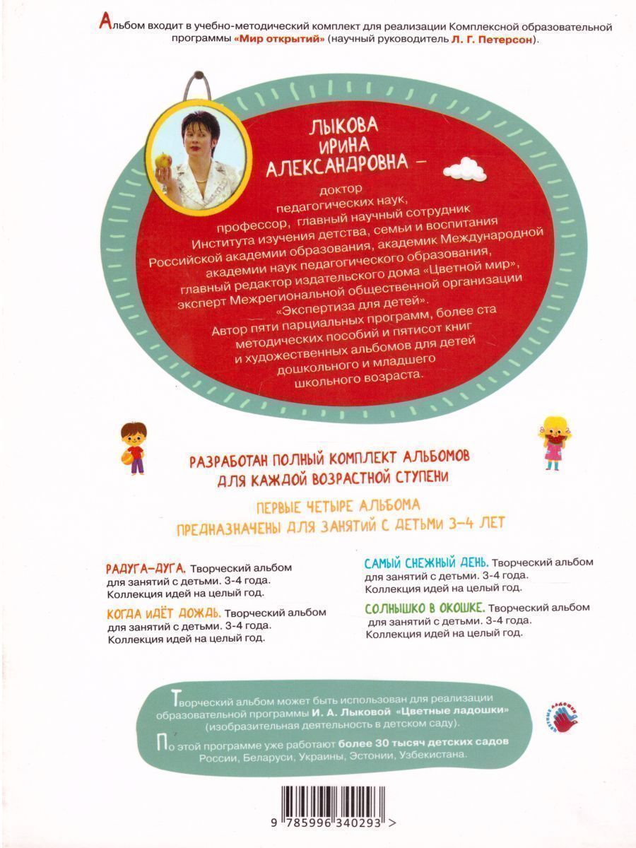 В основе альбома - незавершенные композиции, которые ребенок будет дополнять, помогая героям книжки. Задания-игры помогут увлечь ребенка 3-4 лет художественным творчеством и организовать целый ансамбль разных видов деятельности - рисование, аппликацию, лепку, конструирование. Автор альбома - известный педагог Ирина Лыкова. по её программе "Разноцветные ладошки" работают более 30 000 детских садов России и стран ближнего зарубежья. Соответствует ФГОС ДО.Характеристики