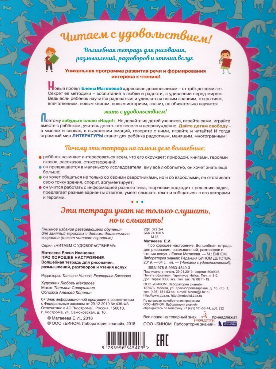 Читаем с удовольствием! Уникальная программа развития речи и формирования интереса к чтеннию! Елена Матвеева - известный автор, методист, эксперт образовательных программ. Ее учебники по литературному чтению входят в Федеральный перечень Министерства образования РФ. Ее книги и пособия пробуждают интерес к чтению, она знает, как сформировать любовь к литературе. Новый проект Елены Мтавеевой адресован дошкольникам - от трёх до семи лет. Замечательно, когда авторы признанных школьных учебников по литературному чтению обращаются к этому возрасту. Ведь любовь к книге, умение слушать с удовольствием, а потом с таким же удовольствием читать закладывают основы не только успешной учебы, но и успешной жизни, гармоничного развития всех ее сторон, развивают эмоциональный и социальный интеллект, открывают новые миры. Секрет методики Елены Матвеевой - в любви и удивлении. Если ребенок полюбит открывать новое, если он научится радоваться и удивляться новым знаниям, открытиям, впечатлениям, значит, он обязательно полюбит читать и будет делать это с удовольствием. Чтение становится для ребенка зоной комфорта. Ведь он умеет хорошо читать и понимать прочитанное, он чувствует текст и полностью воспринимает его смысл. Выпуск пособий предварялся многолетним трудом педагогов дошкольных учреждений, заинтересованных в том, чтобы работа с ребенком была выстроена грамотно, чётко, в системе. Они прошли апробацию в работе как с отдельными детьми, так и с группой детей на занятиях по чтению и развитию речи. Это позволило выбрать верное направление и создать тетради, полезные для детей, педагогов и родителей. "Хотите, чтобы ребенок читал с удовольствием? Забудьте слово "Надо!" Не делайте из детей учеников, играйте сами, играйте вместе с ребенком, учитесь делать это весело и непринужденно. Дайте детям свободу - в мыслях и словах, в выражении эмоций, говорите с ними, играйте и читайте! И тогда огромный мир Литературы станет для ребенка радостным, манящим, многогранным." Ваша Елена Матвеева.Характеристики