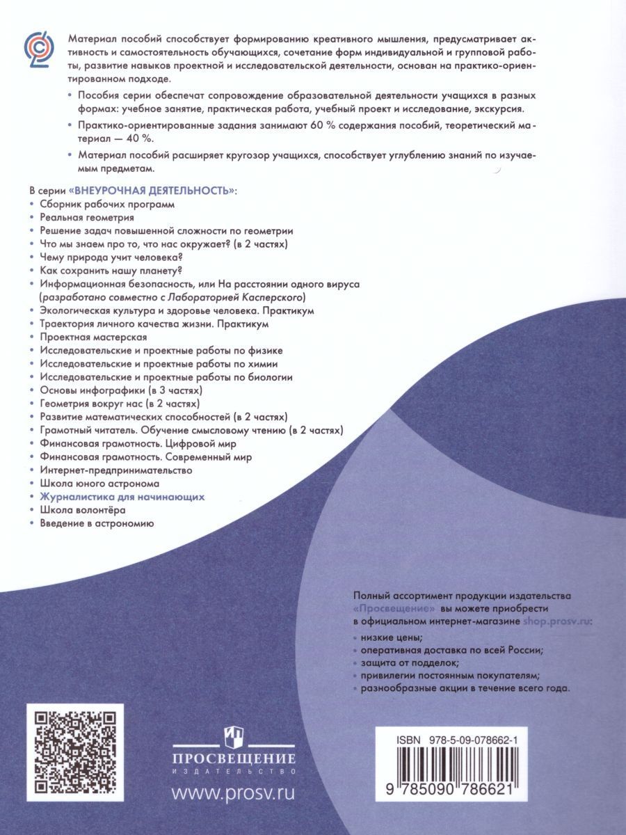 Пособие «Журналистика для начинающих», входящее в серию «Внеурочная деятельность», предназначено для работы с учащимися 8-9-х классов в рамках общеинтеллектуального направления внеурочной деятельности.Характеристики