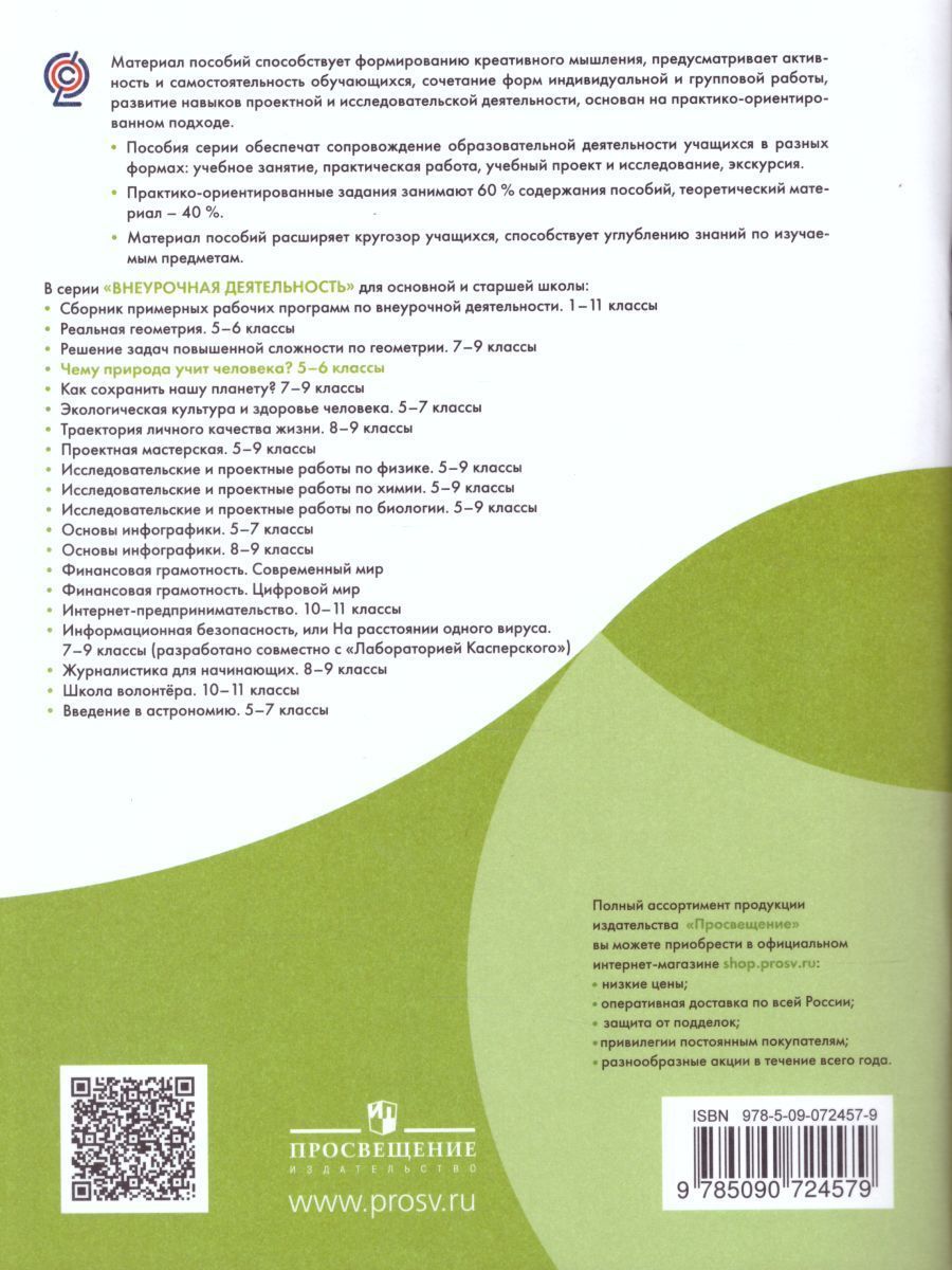 Предлагаемое пособие обеспечивает организацию внеурочной образовательной деятельности обучающихся в 5—6 классах и реализует требования ФГОС. В пособии рассмотрены вопросы о роли природы в жизни человека и роли человека в жизни природы, о науке экологии и проблеме сохранения растительного и животного мира, о взаимосвязях в природе и научно обоснованном природопользовании. Особенности пособия учитывают специфику внеурочной и внешкольной работы: учебный материал, приведённый в пособии, с одной стороны, опирается на полученные ранее знания обучающихся, с другой стороны, значительно расширяет кругозор школьников по каждой теме; содержание пособия обеспечивает сопровождение образовательной деятельности учащихся в разных формах: практическая работа, учебный проект, учебное исследование, учебная экскурсия.Характеристики