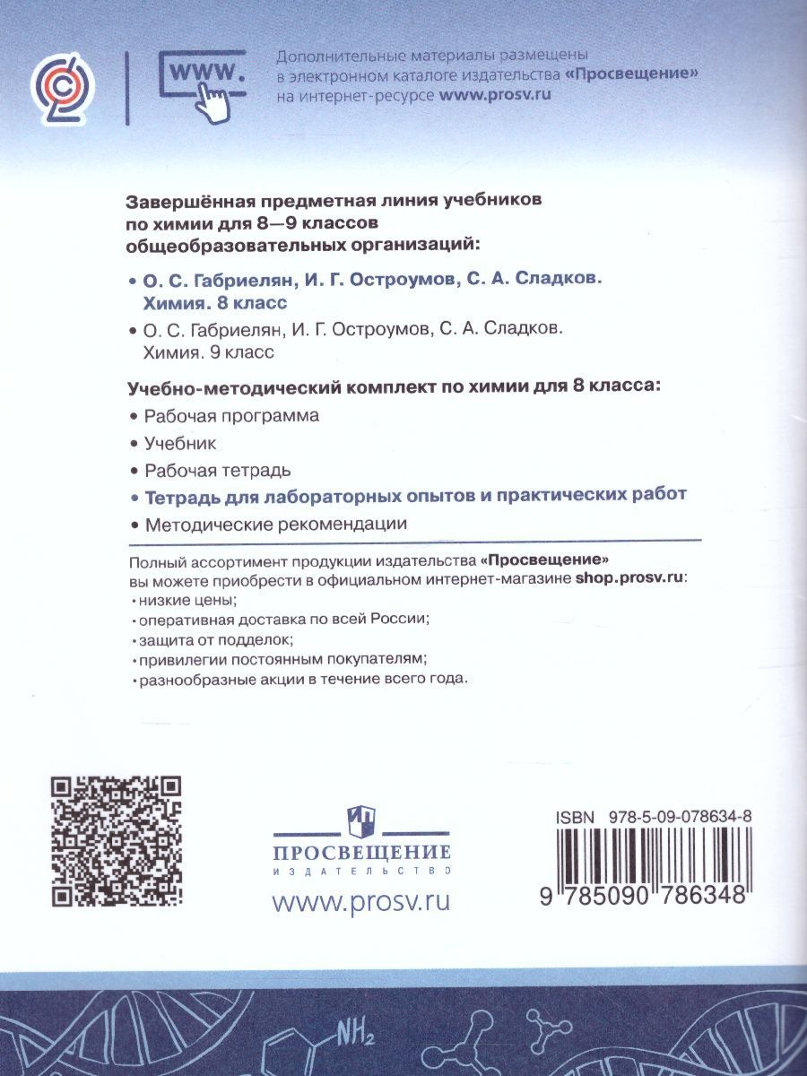 Тетрадь для лабораторных опытов и практических работ создана к учебнику химии для 8 класса общеобразовательных организаций авторов О. С. Габриеляна, И. Г. Остроумова, С. А. Сладкова и по структуре полностью ему соответствует. Тетрадь состоит из трёх частей: правила техники безопасности, лабораторные опыты и практические работы. Тетрадь поможет сформировать и закрепить навыки работы с химическим оборудованием в процессе выполнения эксперимента.Характеристики