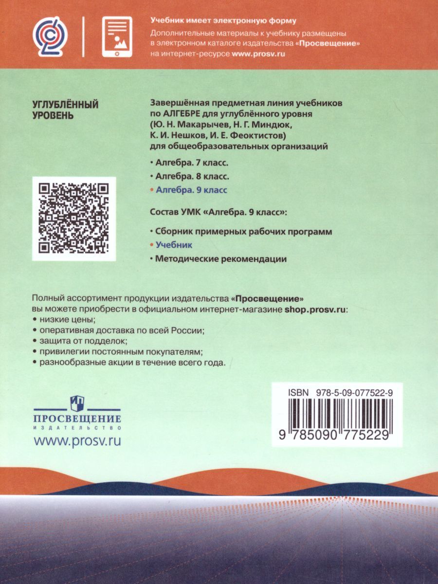 Методическими особенностями линии учебника для 9 класса являются продолжение линий 7 и 8 классов с углублённым изучением алгебры и углубление традиционных учебных тем. В учебнике для 9 класса рассматриваются методы решений уравнений, неравенств с одной переменной и их систем, свойства функций и их графики, преобразования графиков функций, последовательности, элементы комбинаторики и теория вероятностей, тригонометрические функции и их свойства. Система задач в пособии содержит упражнения для работы в классе, упражнения для повторения и дополнительные упражнения в конце каждой главы. Учебник содержит не только большое количество тренировочных упражнений, но и нестандартные задания творческого характера.Характеристики