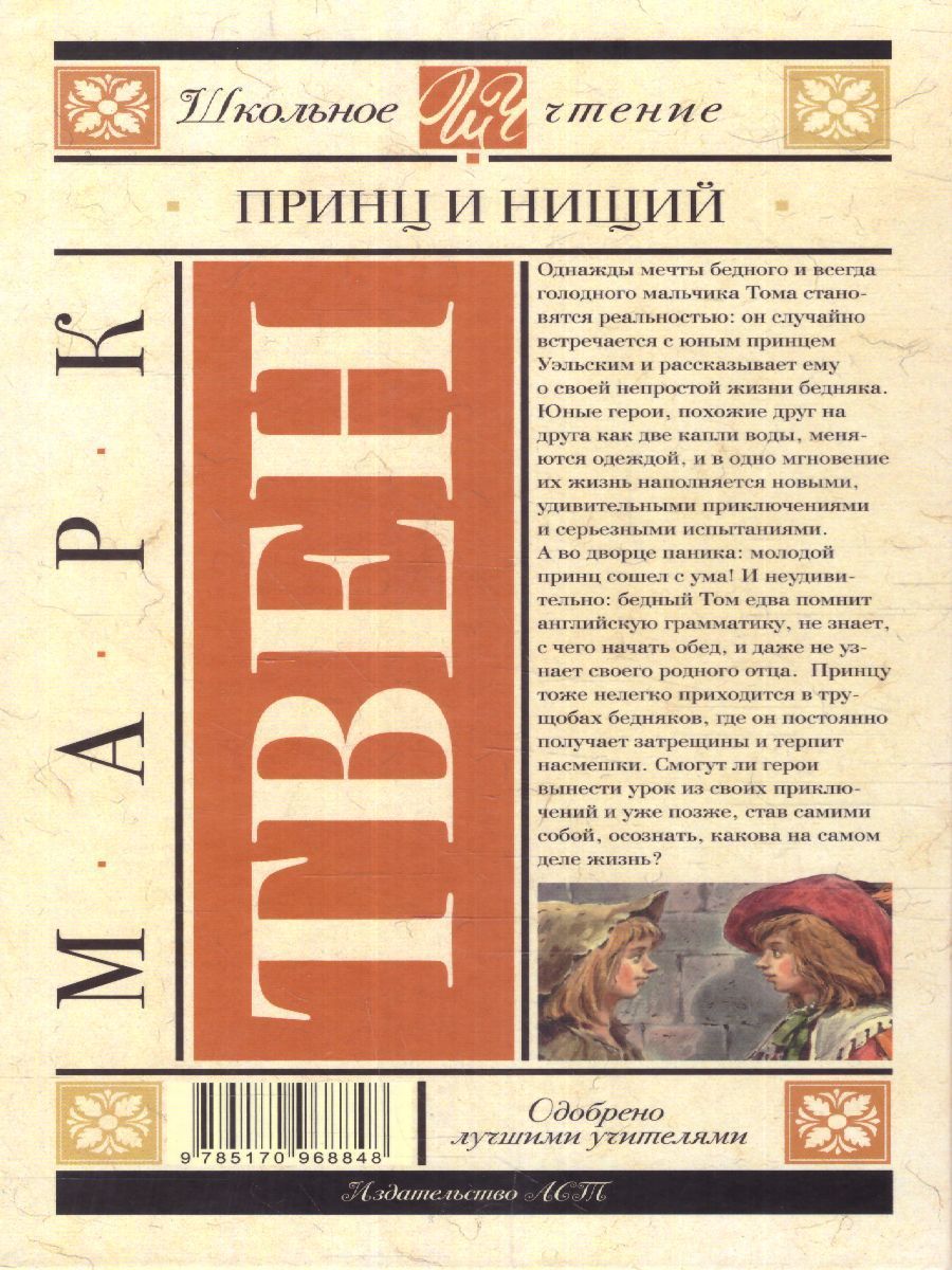 "Принц и нищий" – первый и самый известный исторический роман американского писателя Марка Твена. В нем рассказывается о приключениях английского принца юного Эдуарда Тюдора и маленького оборвыша Тома Кенти, как две капли воды похожих друг на друга, и на время поменявшихся местами. Для среднего школьного возраста.Характеристики