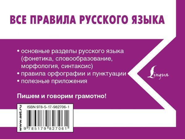 Этот удобный, компактный справочник содержит основные сведения по всем разделам русского языка: фонетике, словообразованию, морфологии, синтаксису и пунктуации. Полезные приложения углубят ваши знания. Окажет помощь всем, кто хочет освежить и систематизировать свои знания по грамматике родного языка и улучшить свою устную и письменную речь.Характеристики