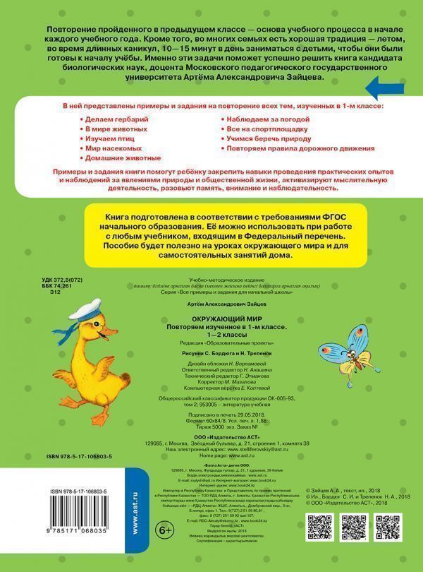 Повторение пройденного в предыдущем классе – основа учебного процесса в начале каждого учебного года. Кроме того, во многих семьях есть хорошая традиция – летом, во время длинных каникул, 10–15 минут в день заниматься с детьми, чтобы они были готовы к началу учёбы. Именно эти задачи поможет успешно решить книга кандидата биологических наук, доцент Московского Педагогического Государственного Университета Артёма Александровича Зайцева. В ней представлены примеры и задания на повторение всех тем, изученных в 1 классе: Учимся правильно делать гербарий В мире животных Изучаем птиц Мир насекомых Домашние животные Наблюдаем за погодой Все на спортплощадку Учимся беречь природу Повторяем правила дорожного движения. Примеры и задания книги помогут ребёнку закрепить навыки проведения практических опытов и наблюдений за явлениями природы и общественной жизни, активизируют мыслительную деятельность, разовьют память, внимание и наблюдательность. Пособие подготовлено в соответствии с требованиями ФГОС начального образования. Его можно использовать при работе с любым учебником, входящим в Федеральный перечень. Книга будет полезна на уроках окружающего мира и для самостоятельных занятий дома.Характеристики