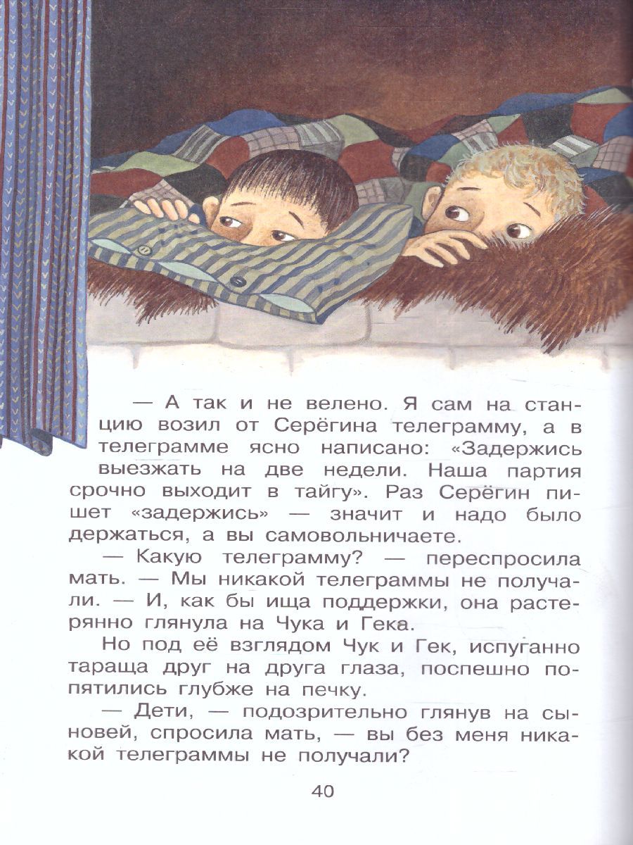 Рассказ А. Гайдара "Чук и Гек", написанный в 1939 году – одно из самых популярных и выдающихся среди произведений про мальчишек. Рассказ про двух мальчиков, которые под самый Новый год вместе с мамой уехали далеко-далеко, на самый край нашей необъятной родины, ради встречи с отцом, наполнен прекрасными описаниями зимней природы, а также наблюдениями и приключениями братьев Чука и Гека. Произведение входит в программу по литературному чтению в начальной школе. Рисунки Ю. Устиновой. Для младшего школьного возраста.Характеристики