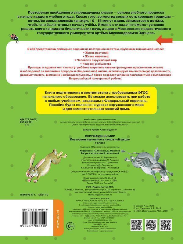 Повторение пройденного в предыдущем классе - основа учебного процесса в начале каждого учебного года. Кроме того, во многих семьях есть хорошая традиция - летом, во время длинных каникул, 10-15 минут в день заниматься с детьми, чтобы они были готовы к началу учёбы. Именно эти задачи поможет успешно решить книга кандидата биологических наук, доцента Московского педагогического государственного университета Артёма Александровича Зайцева. В ней представлены примеры и задания на повторение всех тем, изученных в начальной школе: Жизнь растений, Жизнь животных, Человек и окружающий мир, Человек и общество. Примеры и задания книги помогут ребёнку закрепить навыки проведения практических опытов и наблюдений за явлениями природы и общественной жизни, активизируют мыслительную деятельность, разовьют память, внимание и наблюдательность.А также позволят успешно подготовиться к выполнению Всероссийской проверочной работы.Характеристики