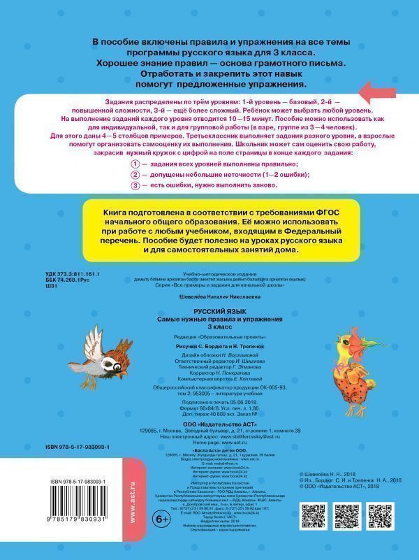 В пособии представлены примеры и задания на все темы и правила школьной программы русского языка для 3 класса. Задания распределены по трем уровням: 1-й уровень - базовый, 2-й - повышенной сложности, 3-й – еще более сложный. Ребенок может выбрать любой уровень. На выполнение заданий каждого уровня отводится 10-15 минут. Пособие можно использовать как для индивидуальной, так и для групповой работы (в паре, группе из 3-4 человек). Для этого даны 4-5 столбцов примеров. Третьеклассник выполняет задания разного уровня, а взрослые помогут организовать самооценку их выполнения. Школьник может сам оценить свою работу, закрасив нужный кружок с цифрой на поле страницы в конце каждого задания: - задания всех уровней выполнены правильно; - допущены небольшие неточности (1-2 ошибки); - есть ошибки, нужно выполнить заново. Материалы книги помогут отработать и закрепить навыки грамотного письма. Пособие подготовлено в соответствии с требованиями ФГОС начального общего образования. Его можно использовать при обучении по любым входящим в Федеральный перечень учебникам как на уроках, так и для домашних занятий.Характеристики