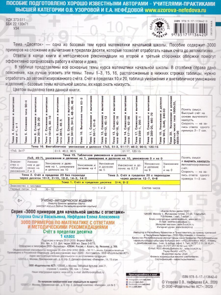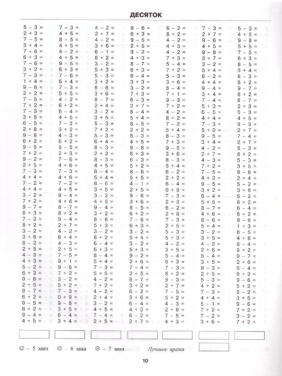 Тема "Десяток" - одна из базовых тем курса математики начальной школы. Пособие содержит 3000 примеров на сложение и вычитание в пределах десяти, которые позволят отработать навык счета до автоматизма. Ответы в конце книги и методические рекомендации на второй и третьей сторонках обложки помогут эффективно организовать работу в классе и дома.Характеристики