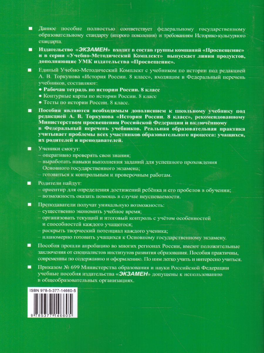 Данное пособие полностью соответствует федеральному государственному образовательному стандарту (второго поколения) и требованиям Историко-культурного стандарта. Рабочая тетрадь соответствует содержанию и структуре учебника под ред. А.В. Торкунова по истории России для 8 класса общеобразовательных организаций (издательство "Просвещение"). В неё включены разнообразные по форме и уровню сложности задания, выполняя которые учащиеся повторяют и углубляют полученные на уроке знания, закрепляют и совершенствуют необходимые умения и навыки. Контурные карты и задания к ним помогут учащимся развить навыки работы с историческим атласом и картами учебника. С тетрадью можно работать как на уроке, так и дома. Рабочая тетрадь предназначена учащимся 8 классов, учителям и методистам.Характеристики