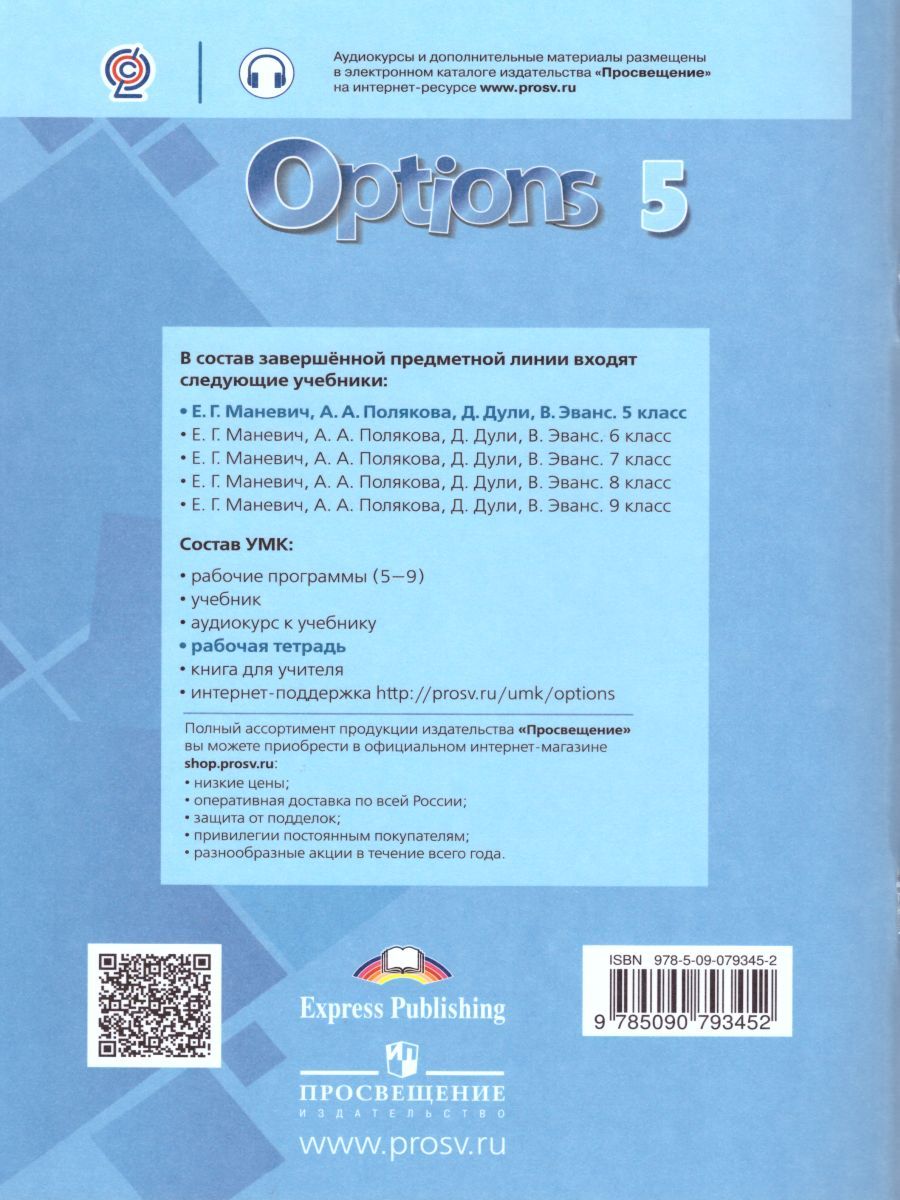 Рабочая тетрадь это элемент учебно-методического комплекта серии «Мой выбор — английский», предназначена для учащихся 5 классов, начинающих изучать английский язык в качестве второго иностранного языка и содержит разнообразные лексико-грамматические упражнения к каждому модулю учебника. Особенности УМК “Options”: — модульное построение учебника — актуальные темы для обсуждения — всестороннее развитие языковых умений — большое количество разнообразных заданий — аутентичный материал о России - раздел Presentation Skills направлен на развитие навыков публичных выступлений, содержит рекомендации, помогающие учащимся правильно оформить и провести презентацию на нужную тему — задания для подготовки к ОГЭХарактеристики