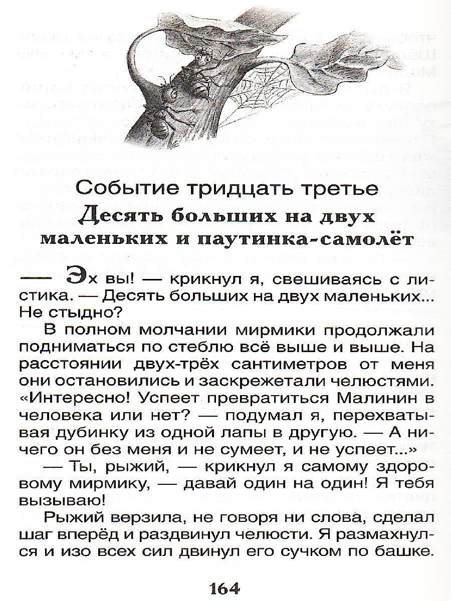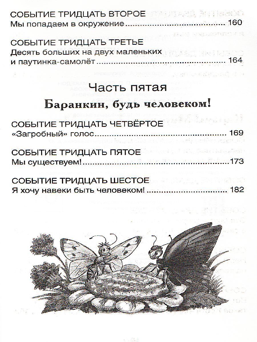 Сказочная повесть о том, как самым обыкновенным мальчишкам, Юре Баранкину и Косте Малинину, вдруг надоело получать двойки, выслушивать нотации и все время делать то, что им говорят. После удивительных превращений в воробьев, бабочек и муравьев и множества невероятных приключений ребята наконец понимают, как же это все-таки здорово — быть человеком!Характеристики