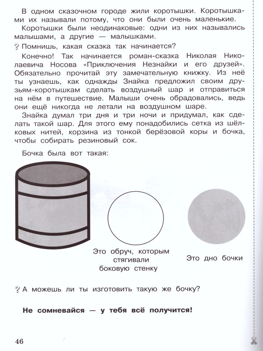 Тетради входят в комплект разрезных учебных тетрадей, предназначенный для учащихся 1-х классов общеобразовательных школ, работающих по программе развивающего образования (система Д.Б. Эьконина – В.В. Давыдова). Они являются приложением к учебникам «Математика, 1 класс» Э.И. Александровой для начальной школы. Первая тетрадь: (№1.) Как сравнивают по длине, ширине, форме и что такое периметр. Вторая тетрадь: (№2.) Как сравнивают по площади. Номера заданий, указанных в скобках, соответствуют номерам в учебнике «Математика.1 класс» Э.И. Александровой. Автор очень хочет помочь ребенку полюбить замечательный и нужный учебный предмет «Математика». С этой целью она подготовила комплект рабочих тетрадей, содержащих систему оригинальных заданий, которые ребенок выполняет или с другими детьми или с родителями, становясь с ними полноправным собеседником. Учителя и родители, самостоятельно занимающиеся с детьми, найдут в тетрадях много интересных заданий, способствующих развитию у ребенка логического мышления, интереса и желания учится. Главное, считает автор, чтобы ребенок хорошенько поработал не только головой, но и руками: вырезая, прикладывая, сопоставляя друг с другом фигуры или предметы, о которых идет речь. Такие задания превращают его в исследователя, который учится сам и может «научить» своих родителей или других детей. Чтобы ребенок захотел выполнять предлагаемые задания, автор обратилась «за помощью» к книге Н.Н. Носова «Приключения Незнайки и его друзей». Дети знают и любят героев этой книги и с удовольствием вспомнят про их увлекательные путешествия. Выбор этот не случаен, ведь в сказке речь идет о коротышках, а значит все предметы, с которыми они имеют дело, - маленькие, именно с такими предметами и будут работать дети. Сказочные персонажи, о которых идет речь в начале каждой новой темы (новой тетради), необходимы для того, чтобы ребенок с удовольствием принялся за выполнение задания, а затем втянулся в его математическое содержание и, таким образом, интерес сместился от сказочных героев к самой математике. Все задания обращены к ребенку, но читая их, конечно же, взрослый который ставит вопросы от себя, вступая тем самым в активный диалог с обучаемым. Это – игра, которая малышу очень понравится. Она поможет и развитию речи, и формированию внимания, способствует умению видеть, слышать и думать. Тетради с успехом могут быть использованы в школах, работающих по любым программам, в детских садах и при домашнем обучении.Характеристики