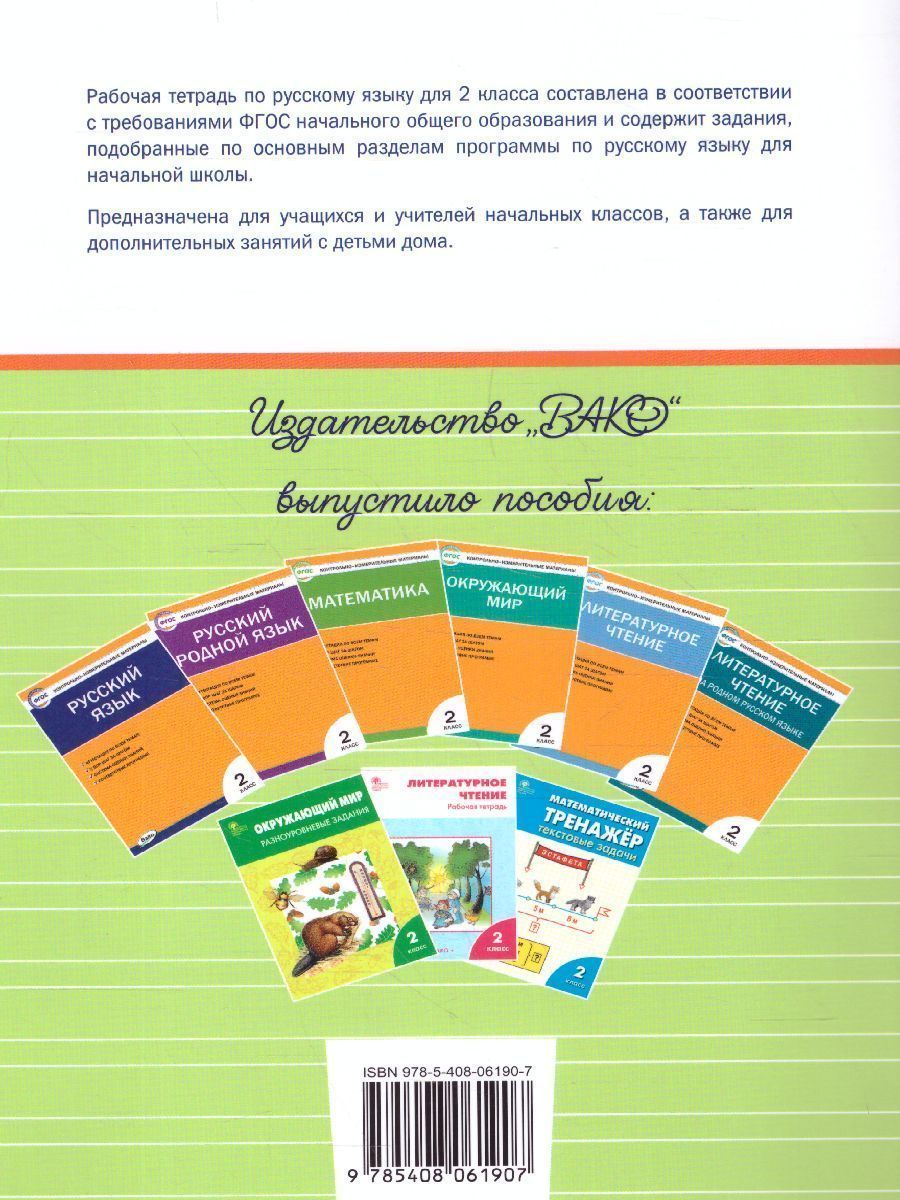 Предлагаемое пособие представляет собой рабочую тетрадь по русскому языку для 2 класса. Оно составлено в соответствии с требованиями ФГОС начального общего образования и содержит задания, сгруппированные по основным разделам программы по русскому языку начальной школы. Издание адресовано учителям начальных классов, учащимся 2 класса и их родителям.Характеристики