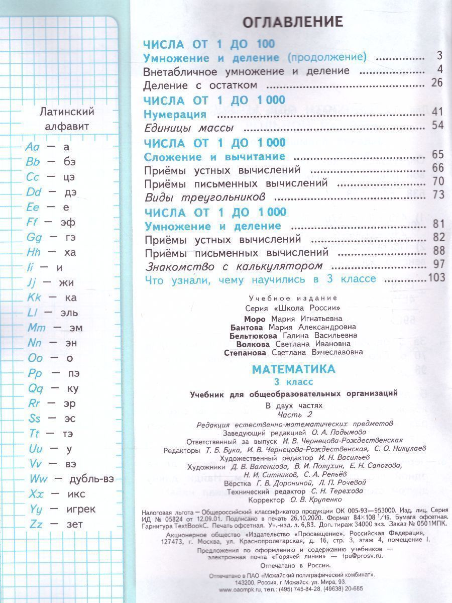 Учебник "Математика" входит в образовательную систему "Школа России". Материал учебника позволяет реализовать системно-деятельностный подход, организовать дифференцированное обучение и обеспечивает достижение личностных, предметных и метапредметных результатов освоения Основной образовательной программы начального общего образования. Система заданий обеспечивает формирование навыка решения учебно-практических задач и развитие у обучающихся функциональной грамотности. Развитие познавательного интереса обеспечат рубрика "Странички для любознательных", логические задачи, задачи на смекалку, а также задания практического характера из реальной жизни. Содержание переработанного учебника имеет ряд изменений: скорректированы тексты заданий, формулировки. Учебник подготовлен в соответствии с требованиями Федерального государственного образовательного стандарта начального общего образования.Характеристики