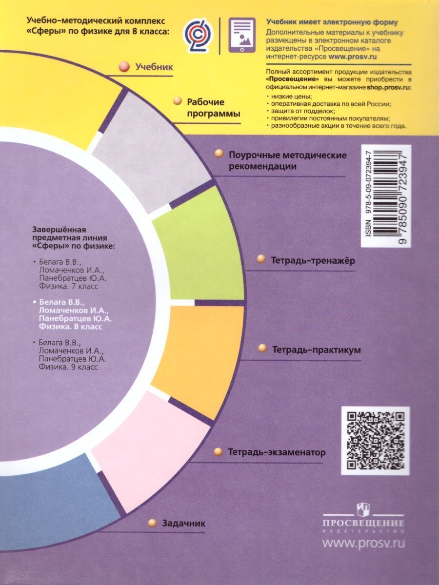 Учебник продолжает линию учебно-методических комплексов "Сферы" по физике. Издание подготовлено в соответствии с требованиями Федерального государственного образовательного стандарта основного общего образования и освещает вопросы курса физики для основной школы. Материал учебников направлен на формирование первых научных представлений о физических законах и явлениях и основывается на достижениях современной физики и техники. Главными особенностями учебников являются фиксированный в тематических разворотах формат, лаконичность и жёсткая структурированность текста, разнообразный иллюстративный ряд. Использование электронных приложений к учебникам позволит значительно расширить информацию (текстовую и визуальную) и научиться применять её при решении разнообразных физических задач и подготовке творческих работ.Характеристики