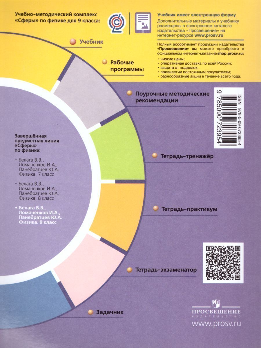 Учебник продолжает линию учебно-методических комплексов "Сферы" по физике. Издание подготовлено в соответствии с требованиями Федерального государственного образовательного стандарта основного общего образования и освещает вопросы курса физики для основной школы. Материал учебников направлен на формирование первых научных представлений о физических законах и явлениях и основывается на достижениях современной физики и техники. Главными особенностями учебников являются фиксированный в тематических разворотах формат, лаконичность и жёсткая структурированность текста, разнообразный иллюстративный ряд. Использование электронных приложений к учебникам позволит значительно расширить информацию (текстовую и визуальную) и научиться применять её при решении разнообразных физических задач и подготовке творческих работ.Характеристики