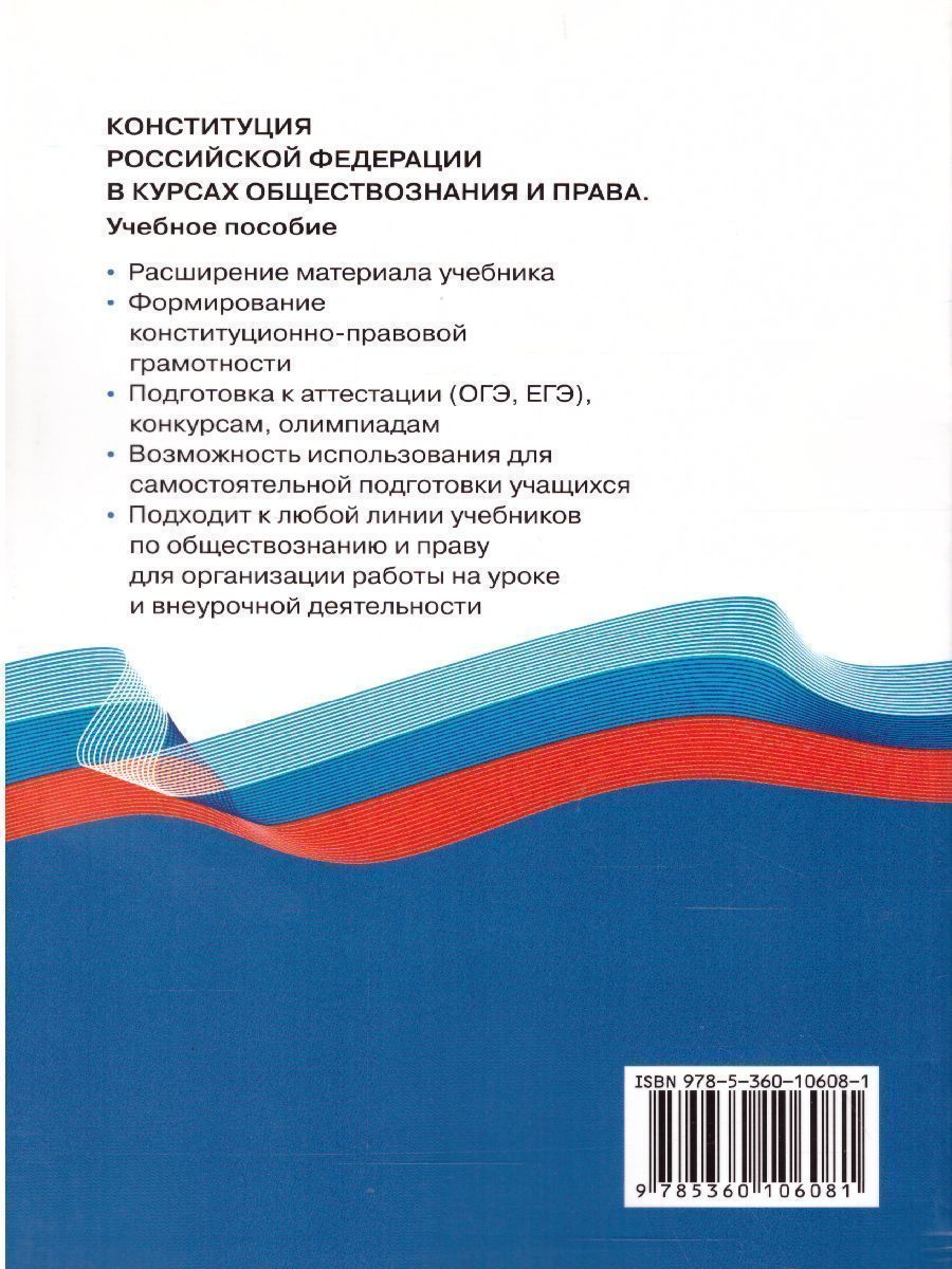 Пособие раскрывает важную тему курса обществознания, посвящённую становлению, укреплению и развитию конституционного строя, правого государства и гражданского общества в современной России. Каждый его раздел последовательно разъясняет сущность и смысл конкретной главы Конституции РФ. При этом активно используются обобщающие схемы (24 элемента наглядности на учебное пособие). Задания в конце разделов в формате ОГЭ и ЭГЭ через тексты современных юристов уточняют и углубляют знания норм Конституционного права. Пособие может быть использовано в качестве практикума для самостоятельной подготовки к ОГЭ и ЭГЭ, поскольку соединяет в себе усложнённый теоретический материал и контрольные задания в формате государственной итоговой аттестации. Оно будет полезно также во внеурочном элективном курсе по Конституционному праву или при изучении вопроса становления конституционализма в России в курсах обществознания и отечественной истории.Характеристики