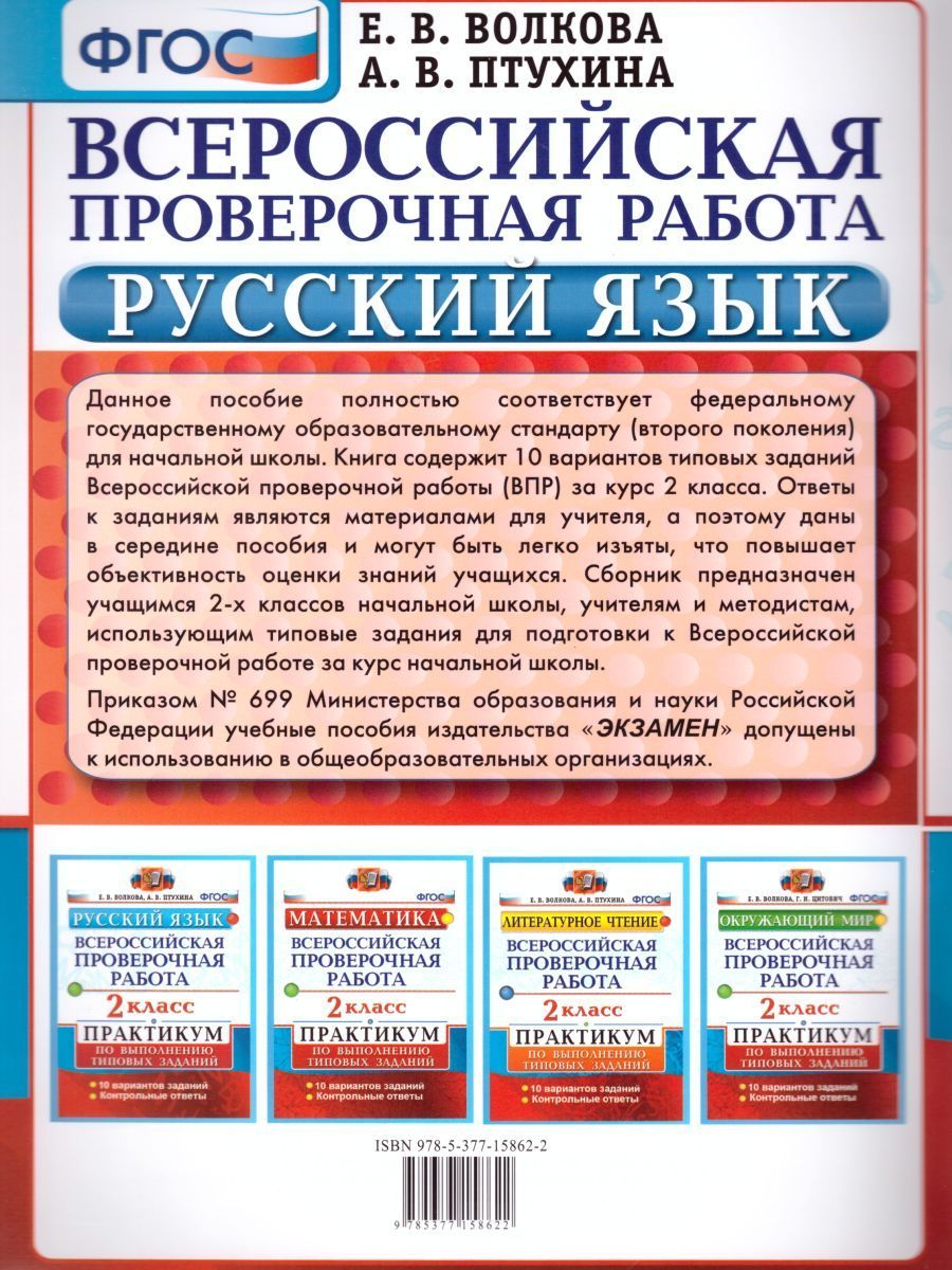 Данное пособие полностью соответствует федеральному государственному образовательному стандарту (второго поколения) для начальной школы. Сборник предназначен для учащихся 2-х классов начальной школы, учителей и методистов, использующих типовые задания для подготовки к Всероссийской проверочной работе за курс начальной школы. Ко всем заданиям работы даны ответы, что позволит использовать пособие не только педагогам, но и родителям, занимающимся с детьми самостоятельно.Характеристики