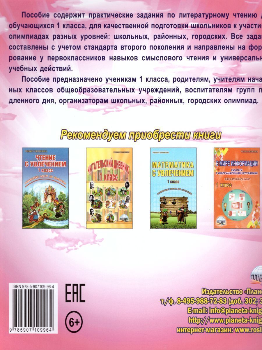 Пособие содержит практические задания по литературному чтению для обучающихся 1 класса, для качественной подготовки школьников к участию в олимпиадах разных уровней: школьных, районных, городских. Все задания составлены с учетом стандарта второго поколения и направлены на формирование у первоклассников навыков смыслового чтения и универсальных учебных действий. Пособие предназначено ученикам 1 класса, родителям, учителям начальных классов общеобразовательных учреждений, воспитателям групп продленного дня, организаторам школьных, районных, городских олимпиад.Характеристики