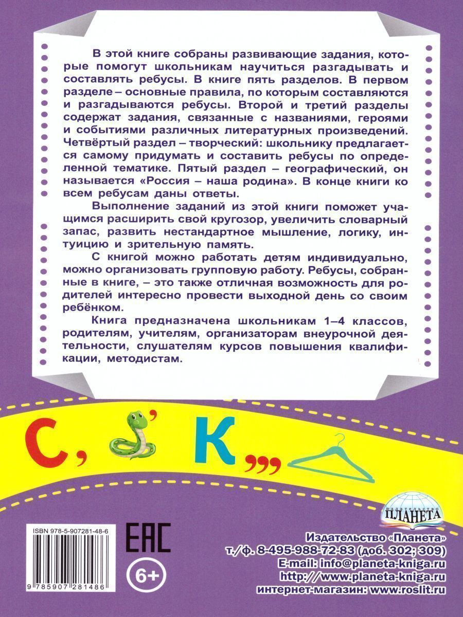 В этой книге собраны развивающие задания, которые помогут школьникам научиться разгадывать и составлять ребусы. В книге четыре раздела. В первом разделе – основные правила, по которым составляются и разгадываются ребусы. Второй и третий разделы содержат задания, связанные с названиями, героями и событиями различных литературных произведений. Четвёртый раздел – творческий: школьнику предлагается самому придумать и составить ребусы по определенной тематике. Выполнение заданий поможет учащимся расширить свой кругозор, увеличить словарный запас, развить нестандартное мышление, логику, интуицию и зрительную память. С книгой можно работать детям индивидуально, можно организовать групповую работу, а также ребусы, собранные в книге, – отличная возможность для родителей интересно провести выходной день со своим ребёнком. Книга предназначена школьникам 1–4 классов, родителям, учителям, организаторам внеурочной деятельности, слушателям курсов повышения квалификации, методистам.Характеристики