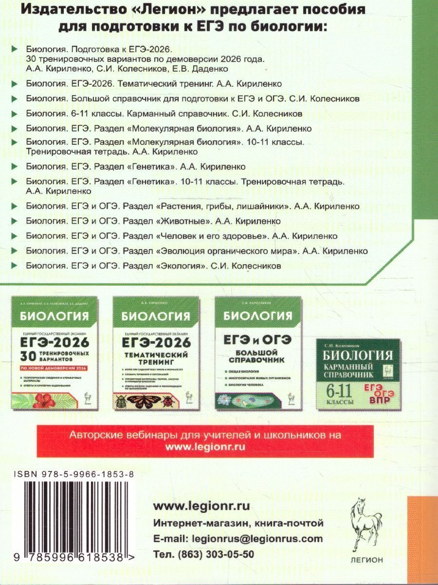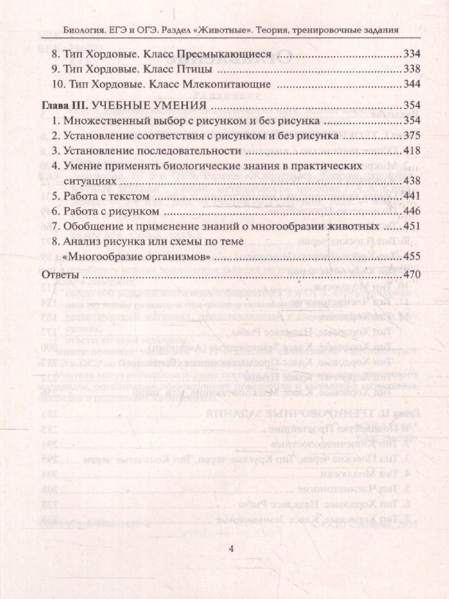 Пособие посвящено разделу биологии "Животные". Книга содержит: - теоретический материал, оформленный в наглядных схемах, таблицах и рисунках; - около 500 заданий всех типов в формате ЕГЭ и ОГЭ, структурированных по темам раздела; - ответы ко всем заданиям с комментариями. Книга поможет учащимся 9-11-х классов качественно подготовиться к ЕГЭ и ОГЭ по биологии и успешно их сдать. Учителя и методисты могут использовать учебное пособие для систематизации изученного материала, организацииХарактеристики