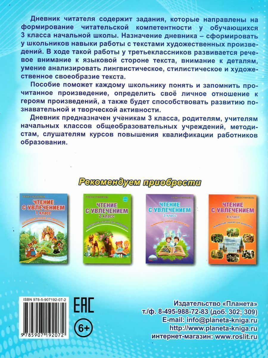 Дневник читателя содержит задания, которые направлены на формирование читательской компетентности у обучающихся 3 класса начальной школы. Назначение дневника – сформировать у школьников навыки работы с текстами художественных произведений. В ходе такой работы у третьеклассников развивается речевое внимание к языковой стороне текста, внимание к деталям, умение анализировать лингвистическое, стилистическое и художественное своеобразие текста. Пособие поможет каждому школьнику понять и запомнить прочитанное произведение, определить своё личное отношение к героям произведений, а также будет способствовать развитию познавательной и творческой активности. Дневник предназначен ученикам 3 класса, родителям, учителям начальных классов общеобразовательных учреждений, методистам, слушателям курсов повышения квалификации работников образования.Характеристики