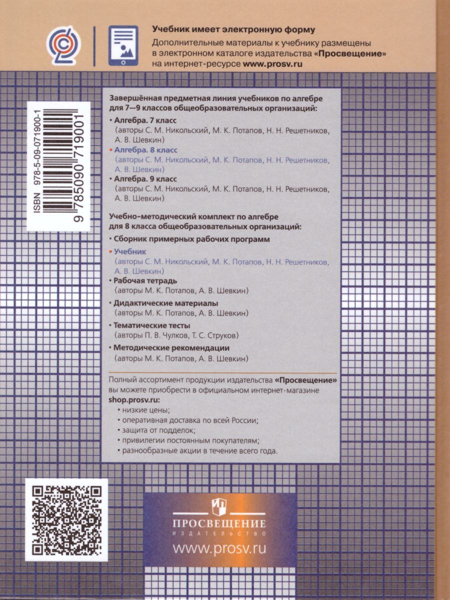 Учебник "Алгебра. 8 класс", является частью завершённой предметной линии учебников по алгебре для учащихся 7—9 классов общеобразовательных организаций. Содержание и структуру материала учебника отличает научность, логичность и полнота изложения. Основной методический принцип, положенный в основу изложения теоретического материала и организации системы упражнений, заключается в том, что ученик за один раз должен преодолевать не более одной трудности. Поэтому каждое новое понятие формируется, каждое новое умение отрабатывается, сначала в "чистом" виде, потом трудности совмещаются. Параллельно основному содержанию в учебнике рассказывается об истории математики и приводится материал, необходимый для работы по программе углублённого изучения математики. Поэтому учебник может быть рассмотрен на предмет утверждения как двухуровневый — для общеобразовательной программы и программы углублённого изучения математики.Характеристики