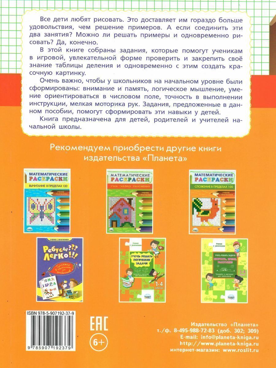 Все дети любят рисовать. Это доставляет им гораздо больше удовольствия, чем решение примеров. А если соединить эти два занятия? Можно ли решать примеры и одновременно рисовать? Да, конечно. В этой книге собраны задания, которые помогут ученикам в игровой, увлекательной форме проверить и закрепить своё знание таблицы деления и одновременно с этим создать красочную картинку. Очень важно, чтобы у школьников на начальном уровне были сформированы: внимание и память, логическое мышление, умение ориентироваться в числовом поле, точность в выполнении инструкции, мелкая моторика рук. Задания, предложенные в данном пособии, помогут сформировать эти навыки у детей. Книга предназначена для детей, родителей и учителей начальной школы.Характеристики