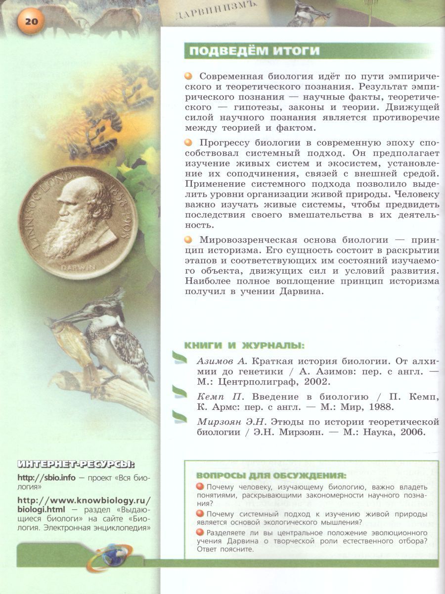 Учебник "Биология" для 10 класса начинает линию УМК "Сферы" для средней школы на базовом уровне .Он соответствует примерной образовательной программе и базисному учебному плану по биологии (в объеме 1 ч/нед.), требованиям ФГОС, а также авторской рабочей программе. В предлагаемом курсе биологии реализуется общая цель образования – формирование и развитие качеств личности, отвечающих потребностям современного общества. Главное внимание уделено основным законам и теориям биологии, охватывающим разные уровни организации живой природы. В данном учебнике рассмотрены вопросы строения и функций клетки, размножения и развития, основные закономерности наследственности и изменчивости. Особенностями учебника являются фиксированный в тематических разворотах формат, лаконичность и жёсткая струтурированность текста, разнообразный иллюстративный ряд. Разворотный принцип построения учебника в сочетании с последовательным отбором содержания учебного материала глав и компонентов каждой темы урока обеспечивает работу учителя и ученика в узнаваемой информационной среде. Использование учебника в качестве навигатора позволяет применять разнообразные информационные ресурсы УМК, выбирать формы и методы организации учебного процесса в соответствии с уровнем обученности учащихся, реализовывать принцип самообразования и самопроверки достигнутых результатов.Характеристики