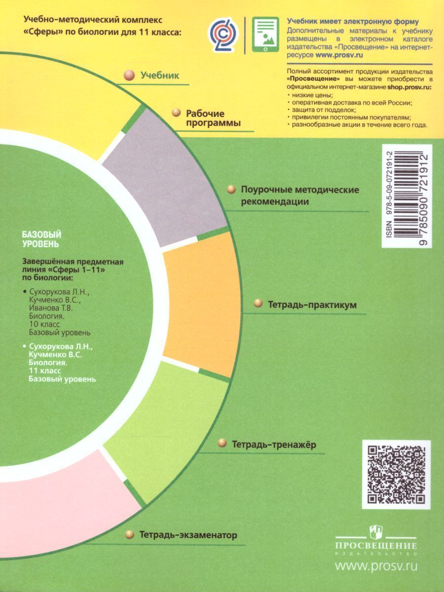 Учебник "Биология" для 11 класса начинает линию УМК "Сферы" для средней школы на базовом уровне .Он соответствует примерной образовательной программе и базисному учебному плану по биологии (в объеме 1 ч/нед.), требованиям ФГОС, а также авторской рабочей программе. В предлагаемом курсе биологии реализуется общая цель образования – формирование и развитие качеств личности, отвечающих потребностям современного общества. Главное внимание уделено основным законам и теориям биологии, охватывающим разные уровни организации живой природы. В данном учебнике рассмотрены: прикладные направления изучения наследственности и изменчивости, экологические законмерности, микро- и макроэволюция, происхождение и историческое развитие жизни на Земле, антропогенез, место человека в биосфере. Особенностями учебника являются фиксированный в тематических разворотах формат, лаконичность и жёсткая струтурированность текста, разнообразный иллюстративный ряд. Разворотный принцип построения учебника в сочетании с последовательным отбором содержания учебного материала глав и компонентов каждой темы урока обеспечивает работу учителя и ученика в узнаваемой информационной среде. Использование учебника в качестве навигатора позволяет применять разнообразные информационные ресурсы УМК, выбирать формы и методы организации учебного процесса в соответствии с уровнем обученности учащихся, реализовывать принцип самообразования и самопроверки достигнутых результатов.Характеристики