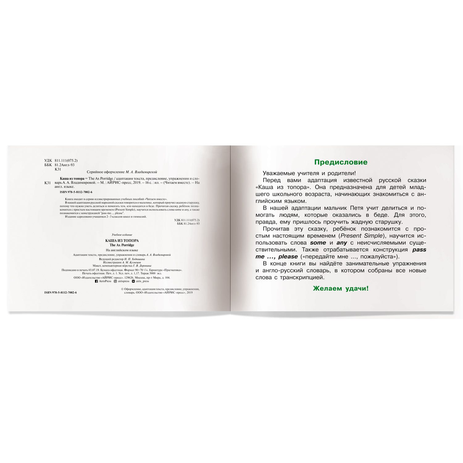 Каша из топора. На английском языке. Книга входит в серию иллюстрированных учебных пособий «Читаем вместе». В нашей адаптации русской народной сказки говорится о мальчике, который проучил жадную старушку, потому что нужно уметь делиться и помогать тем, кто находится в беде. Прочитав сказку, ребёнок познакомится с простым настоящим временем (Present Simple), научится использовать слова some и any, а также познакомится с конструкцией "pass me..., please". Издание адресовано учащимся 2-3 классов школ и гимназий.Характеристики