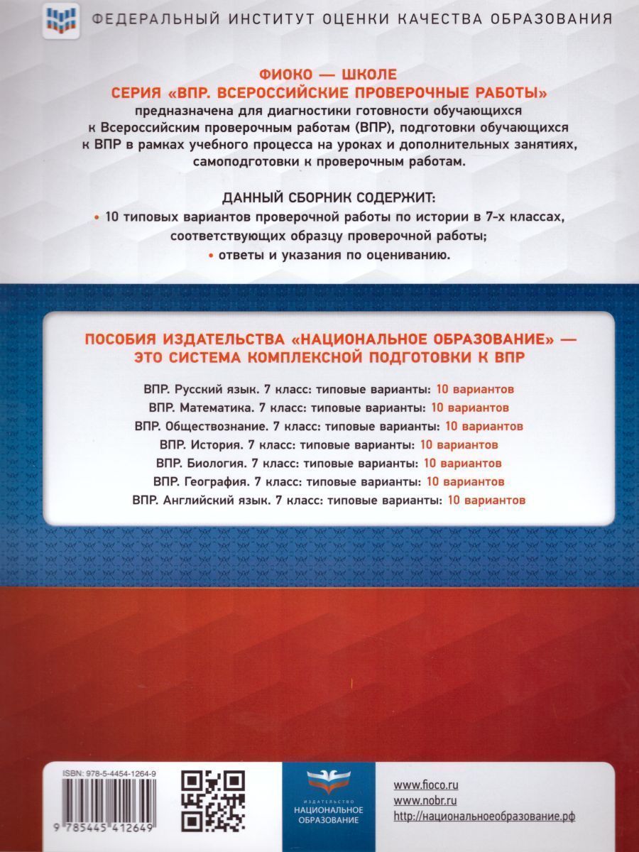 Серия подготовлена разработчиками вариантов для проведения Всероссийских проверочных работ. В сборнике представлены: - 10 типовых вариантов проверочной работы по истории в 7-х классах, составленных в соответствии с образцом проверочной работы; - инструкция по выполнению работы; - ответы и указания по оцениванию; - карта индивидуальных достижений, фиксирующая результаты выполнения всех вариантов проверочной работы. Выполнение типовых вариантов предоставляет обучающимся возможность самостоятельно подготовиться к Всероссийским проверочным работам и объективно оценить уровень своей подготовки. Учителя могут использовать издания серии для организации контроля результатов освоения школьниками образовательных программ основного общего образования и интенсивной подготовки обучающихся к Всероссийским проверочным работам.Характеристики